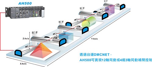 AH500的優(yōu)異運動控制功能,可實現(xiàn)任意三軸直線補間、任意兩軸圓弧補間、及任意三軸螺旋補間與連續(xù)補間功能,透過臺達DMCNET高速通訊網(wǎng)絡架構,可達到1ms的指令周期內(nèi)12軸同動或4組3軸同動補間功能。無論是復雜的過程控制或是精密的運動控制需求,都能透過AH500來實現(xiàn),有效應用于各種產(chǎn)業(yè)機臺,如建材機,經(jīng)編機,食品包裝機等等。